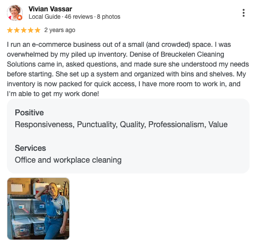 “Great cleaning service and very friendly people to talk to. Denise always answers my emails/calls promptly and Wendy has come over a couple of times and she has been great. The apartment looks spotless! Definitely recommend it :).”